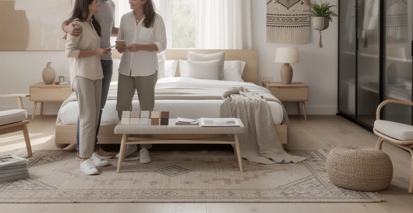 Un projet de chambre haut de gamme peut, par exemple, combiner un parquet en chêne chevron, une tête de lit en velours côtelé, des rideaux en lin lourd doublé et des tables de chevet en placage noyer. Les murs peuvent être habillés de panneaux décoratifs en bois cannelé, de peinture mate profonde ou de chaux teintée, qui absorbent délicatement la lumière. Les finitions métalliques – laiton brossé, nickel satiné, acier noir – se déclinent par touches dans les poignées, les luminaires ou les piètements de meubles, créant une cohérence subtile.